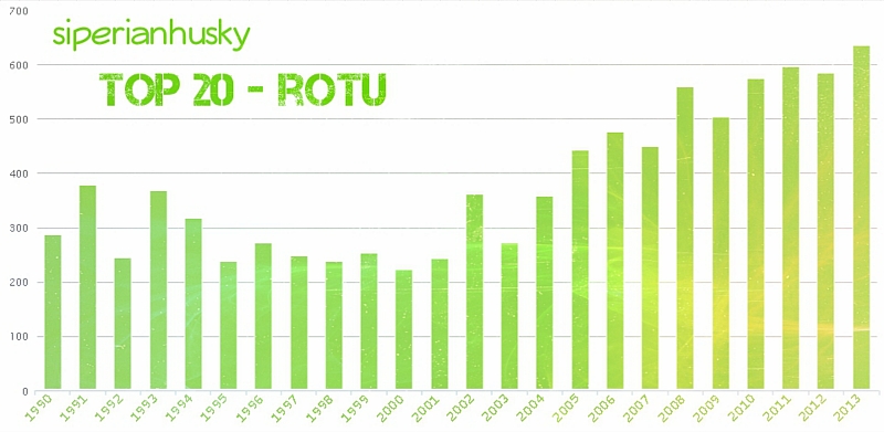 Siperianhuskyn rekisteröintimäärien kasvua, vuonna 2013 siperianhusky oli Suomen 18. suosituin rotu.
