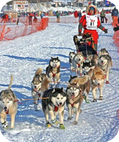 Kuvassa oikealla siperianhuskyja Iditarod-kilpailussa 2007. Kaksi niistä INT CH Troika's Nordic Icon ja INT CH Troika's Nordic Blizzard ovat suomalaisen Kuuhaukun Ikuisen Rakkauden jälkeläisiä. Kuva on otettu seremoniallisessa startissa, jossa koirat esittelevät paikallisten lasten askartelemia koiratossuja. Kuva Carol Dixon, Troika kennels.