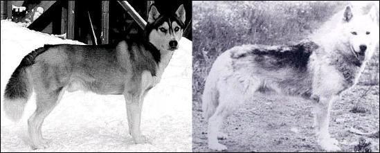 Kuvassa: Kuuhaukun Tähtisumua (syntynyt 2003) ja sen isoisä Natomah's Ruff-N-Reddi viiden sukupolven takaa (Mikiuk Tuktu Tornyak x Nenana Of Natomah). Kiinnitä huomiota identtisiin mittasuhteisiin, kulmauksiin ja luuston vahvuuteen. Kuvissa kumpikaan koira ei ole täydessä turkissa, omistajansa Vargevass kennelin Karsten Grönåsin mukaan se oli hänen makuunsa liian pitkäkarvainen.