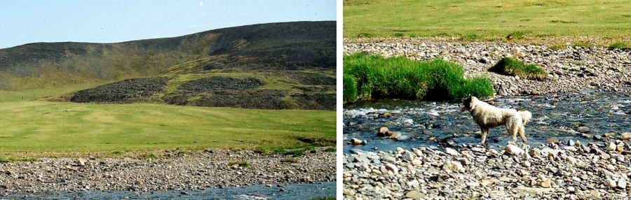 Vaalean koiran turkki on nokeentunut harmaaksi lämmityksessä käytetyn polttoaineen savusta.