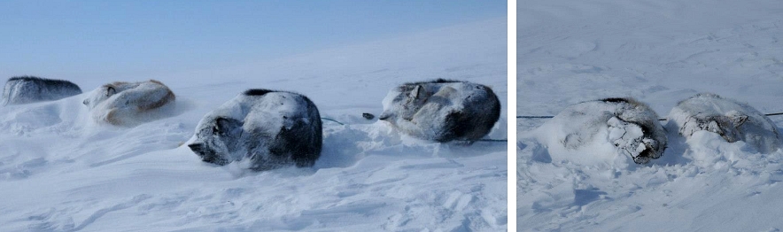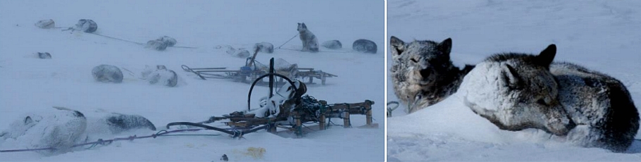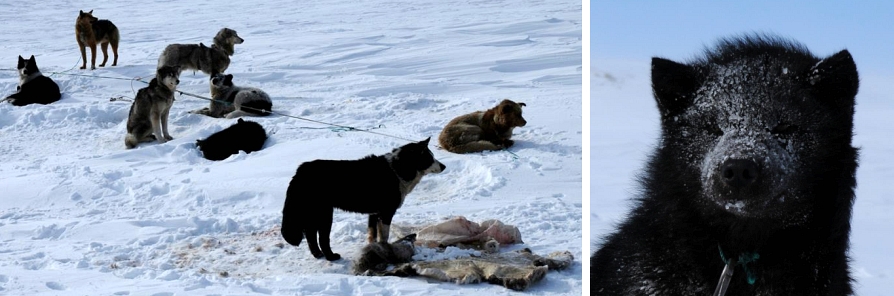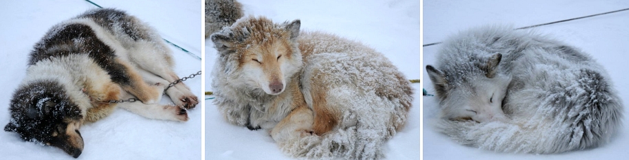 nartta-mallisten rekien edessä. Aamun valjetessa lumen ja jään alta kuoriutuu hyvin levänneitä rekikoiria.